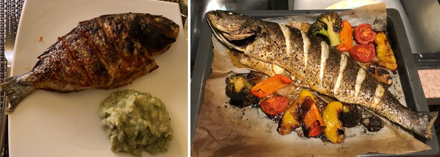 Im Bild vom Balkon gab es übrigens warme Wachtelbrüstchen und Frischkäsekroketten auf Salat, darunter Dorade mit Broccoli-Kartoffelstock bzw Corvina (Seebarsch) mit Gemüse aus dem Ofen. Genuss pur ! Den Silvester haben wir mit Rindsfilet gefeiert und bald kennen wir alle Weine Spaniens, die im Supermarkt um die Ecke verkauft werden.