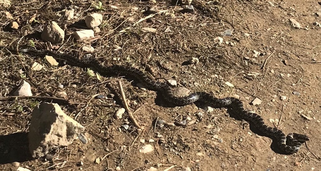 Und währenddem Monika und ich südwärts wanderten, erkundeten Daniel und die Hunde die Umgebung und trafen bei der Gelegenheit auf diese gut anderthalb Meter lange Viper (oder Natter ?), die gerade dabei war, die Strasse zu überqueren