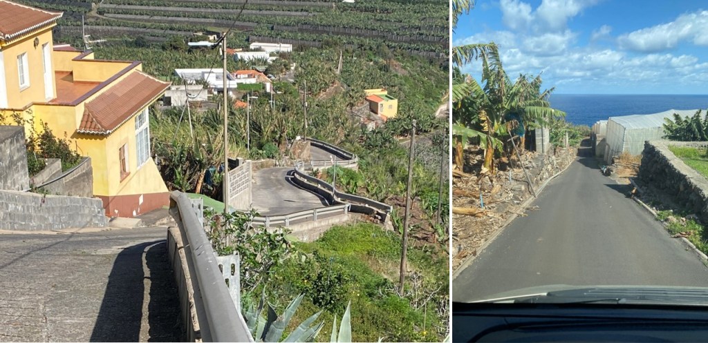 Muss nicht der von oben kommende Wagen aus dem Weg, wenn man sich begegnet ? Wie soll denn das gehen mit Mauern auf beiden Seiten ? Ich blieb ratlos stehen auf der oberen Strasse, sprach dann einen alten Palmero an vor einer Bar – und wurde von ihm auf einen Umweg mit weniger steilem Weg geschickt. Viel breiter waren die Strassen dort auch nicht, aber immerhin nicht ganz so eingemauert und nicht ganz so steil.