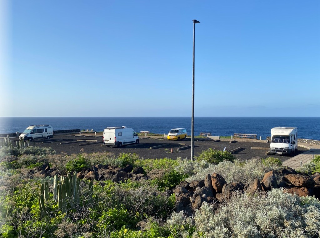 Für Camper steht ein grosszügiges Feld über dem Meer zur Verfügung – mit Tischen und Bänken und Lämpchen auf der Seite des Meeres (allerdings ohne Stromanschluss für unsereins). Vier Campers, vier Länder, von links nach rechts: eine Schweizerin (😊), zwei Iren, zwei Deutsche und eine Österreicherin (mit Hund).