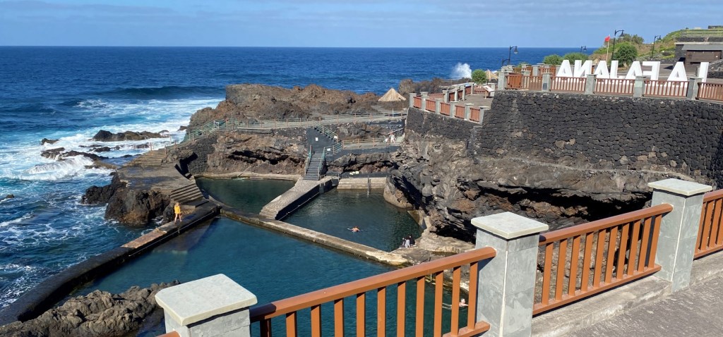 Überraschung ! Ein Schwimmbecken gleich neben dem stürmischen Meer, gemütlich zu besichtigen von der La Gaviota -Terrasse aus. Da schwimmen sogar ein paar Leute drin. Das könnte ich doch auch wieder einmal versuchen.