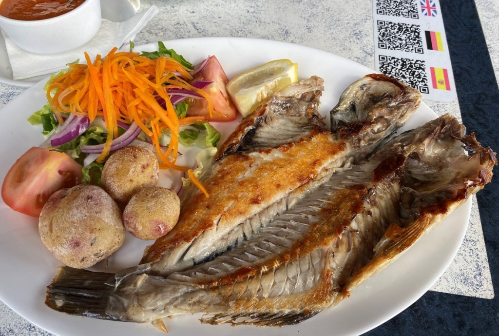 Papageienfisch vom Grill, dazu Runzelkartoffeln (Papas Arrugás), eine kanarische Spezialität, im Restaurante La Cofradía. Kürzlich hat jemand behauptet, hier würde alles frittiert, was hiermit widerlegt sei. Zugegeben: das Restaurant gehört der Fischer-Zunft, das hilft bestimmt bei der richtigen Zubereitung.
