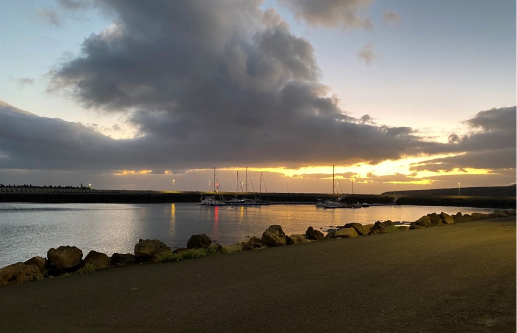Mein letzter Blick am Abend von meiner Sitz-Stufe aus. Gleich hinter der Hafenmauer im Hintergrund beginnt ein wunderschöner Strand.