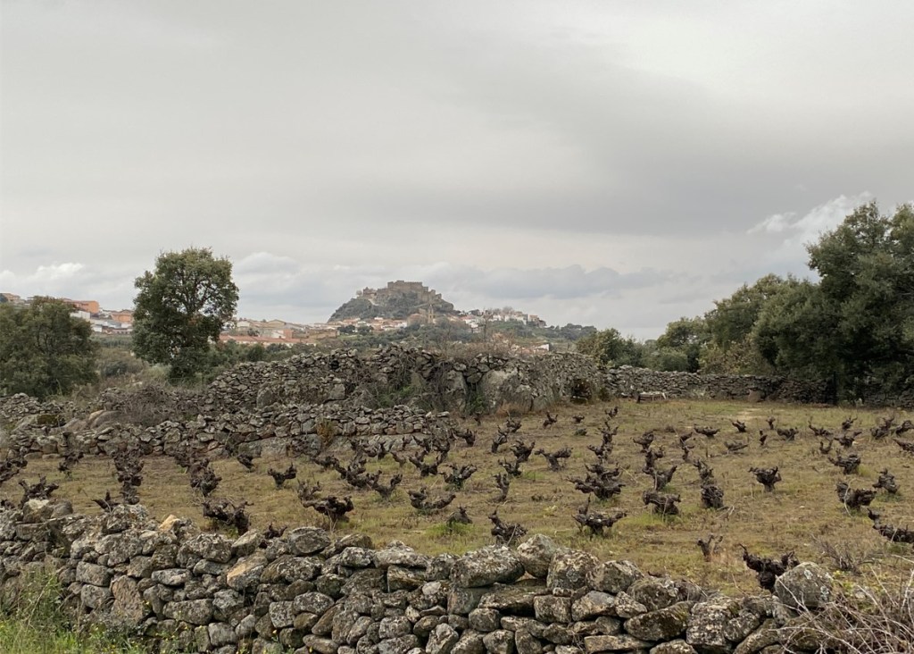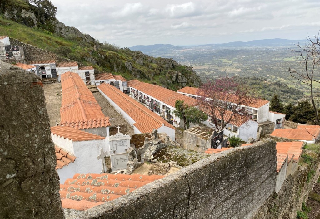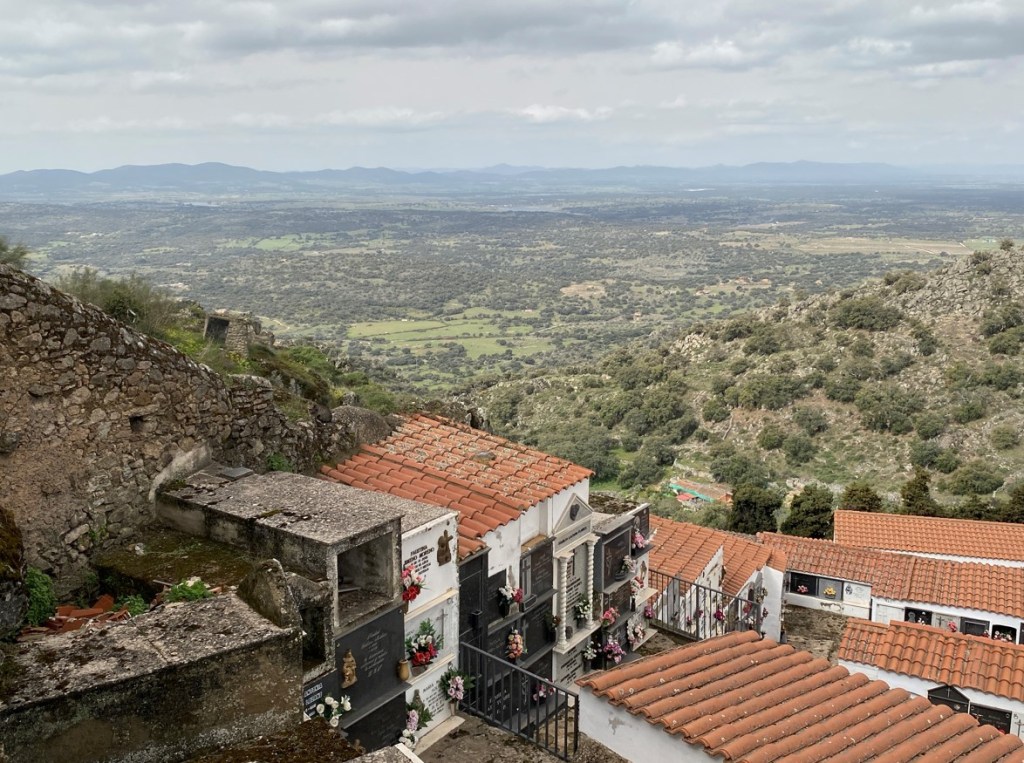 Der Friedhof gleich unterhalb der Burg von Montánchez wurde im Jahr 1810 dem steilen Granithang abgetrotzt und in Terrassen angelegt, so dass der Blick von jeder Terrasse aus weit über die Ebenen der Extremadura schweifen kann.