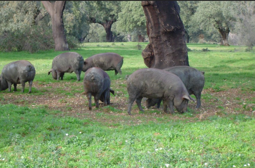 Bei meiner Weiterreise bin ich an einem riesigen Feld voller Pata Negra – Schweinen vorbeigekommen. Es fehlten Suhlkuhlen und zerwühlter Acker. Na klar ! Diese Schweine haben das Wühlen nach Nahrung nicht nötig – ihre fette Beute fällt ihnen direkt von den Eichen vor die Patas Negras…