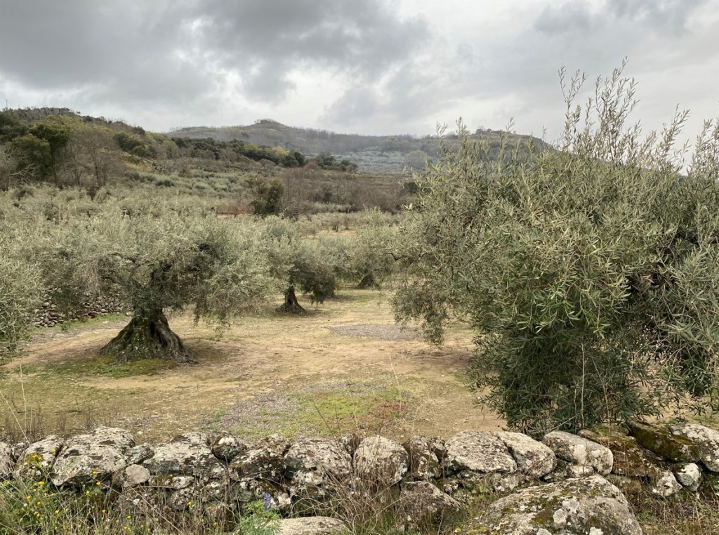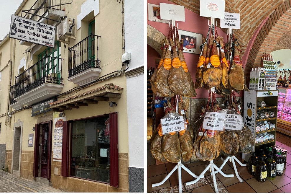 Montánchez. Der Camperstop Alegría liegt versteckt im Wald rechts oben gleich unterhalb vom langgestreckten, einzeln stehenden Gebäude, welches sich als Trocknungshalle für den berühmten Jamón Ibérico entpuppte. Überhaupt sind wir hier im Land dieses Schinkens gelandet; die Extremadura und Andalusien sind besonders bekannt dafür. Die edelste Sorte dieses Schinkens stammt vom etwas kleineren, schwarzfüssigen Schwein Pata Negra, welches sich frei in Eichenwäldern tummelt und sich dort vor allem von Eicheln ernährt.