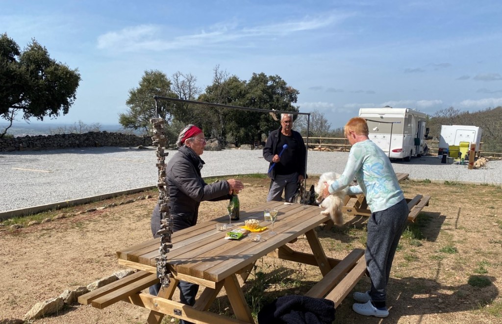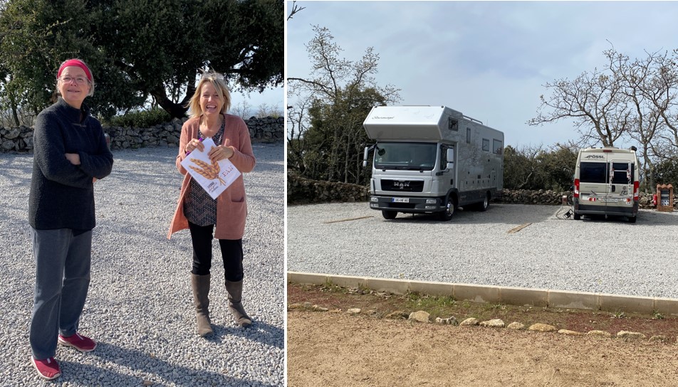 Annette, meine flotte Nachbarin aus dem dicken Schiff neben mir. Sie, Hubsy und ihr Schäferhund wohnen seit ein paar Monaten Vollzeit im WoMo. Rechts neben ihr die Platzbesitzerin Yvon mit dem täglichen Brötchenservice-Angebot fürs Frühstück am nächsten Tag.