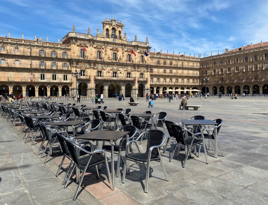 Auf nach Salamanca. Die barocke Plaza Mayor aus dem 18. Jahrhundert. Wir waren so beeindruckt, dass wir uns gleich einmal in ein Restaurant am Platz setzten und ein paar Tapas bestellten (sie werden hier Pinchos genannt).