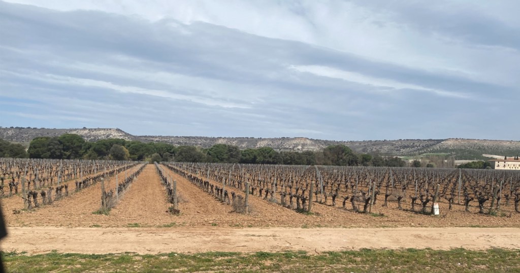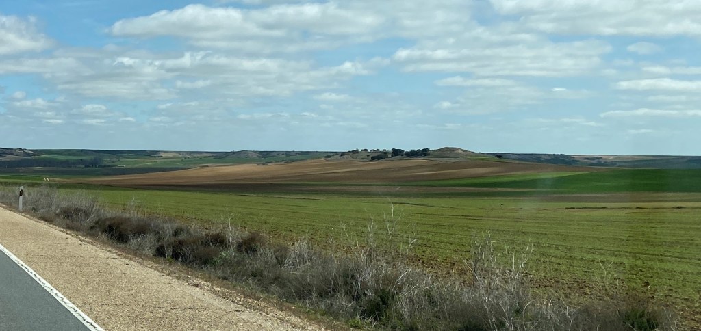 Castilla y León ist die grösste Region Spaniens und eine weite Hochebene. Man ist beinahe ständig auf etwa 700 m.ü.M., was die eher bescheidenen Temperaturen erklärt. Hier liegt übrigens auch das Weingebiet Ribera del Duero. Saftig grüne Wiesen, frisch gepflügte Felder, sanft gewellte Hügel prägen die Gegend. Und Reben ! Malerisch.