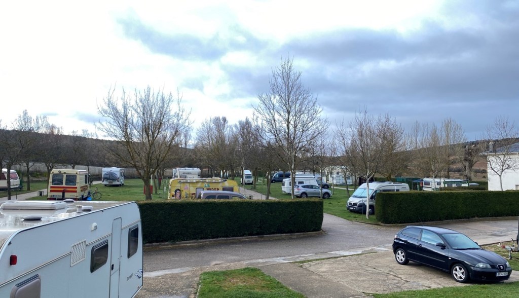 Der Campingplatz in Sorio auf dem Weg nach Saragossa. Gleich neben dem Platz lebt eine ganze Storchenkolonie.
