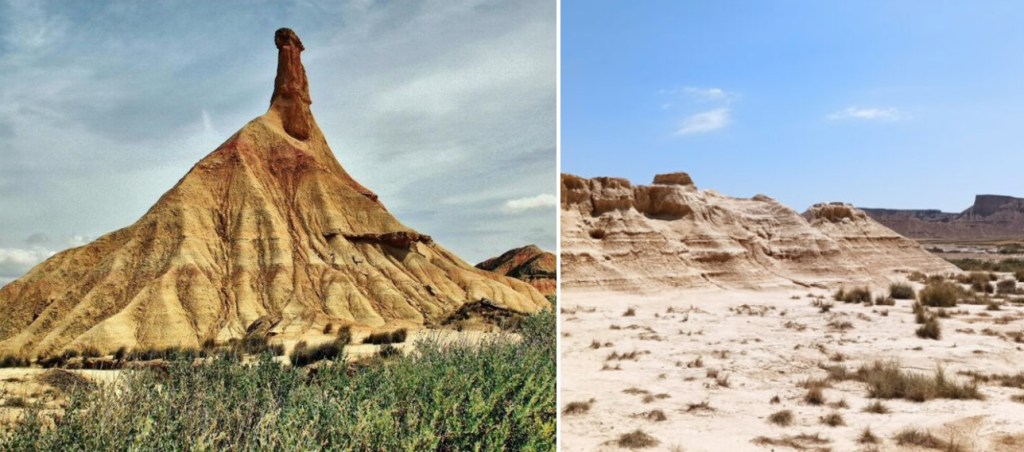 Die Pyramide ‘Castildetierra’ ist das Wahrzeichen der Wüste Bardenas Reales. Sie besteht aus Lehm und Sandstein und wird stetig von Wind und Wetter abgetragen. Der etwas.. ähm… suggestive Kamin steht nur noch dank einer natürlichen steinernen Platte ganz oben, welche die totale Erosion noch für eine Weile behindert.