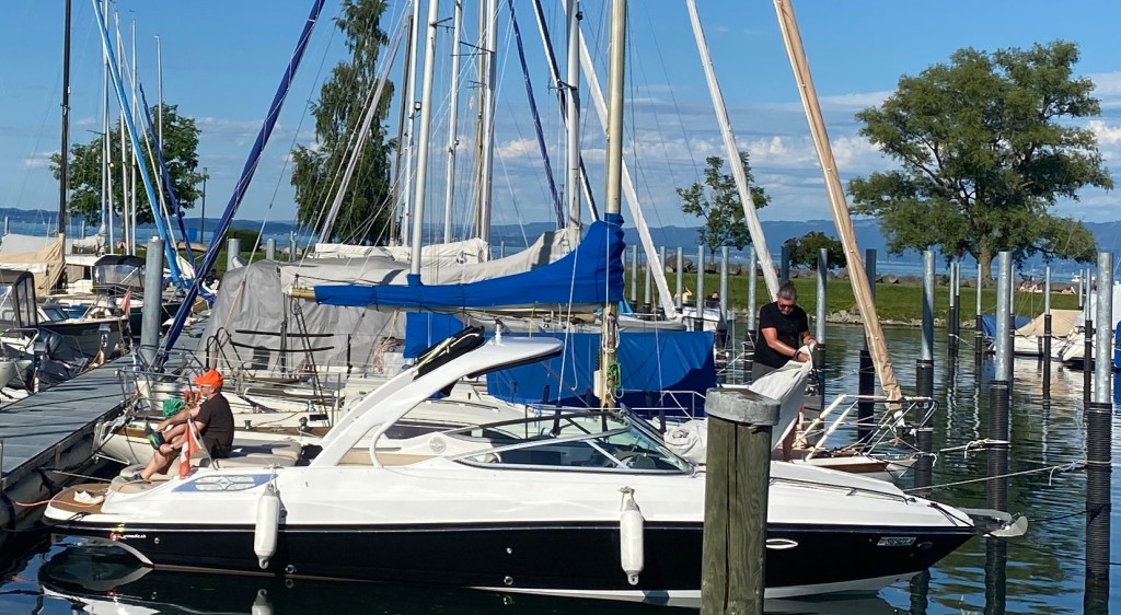 Im Bild oben sind wir eben zurück von einem sonnigen Tag auf dem Bodensee mit gemütlichem Lunch an Bord. Urs mit der orangen Mütze wartet hinten auf dem Boot auf seinen Einsatz, und Andy entfaltet vorne die Abdeckplane.
