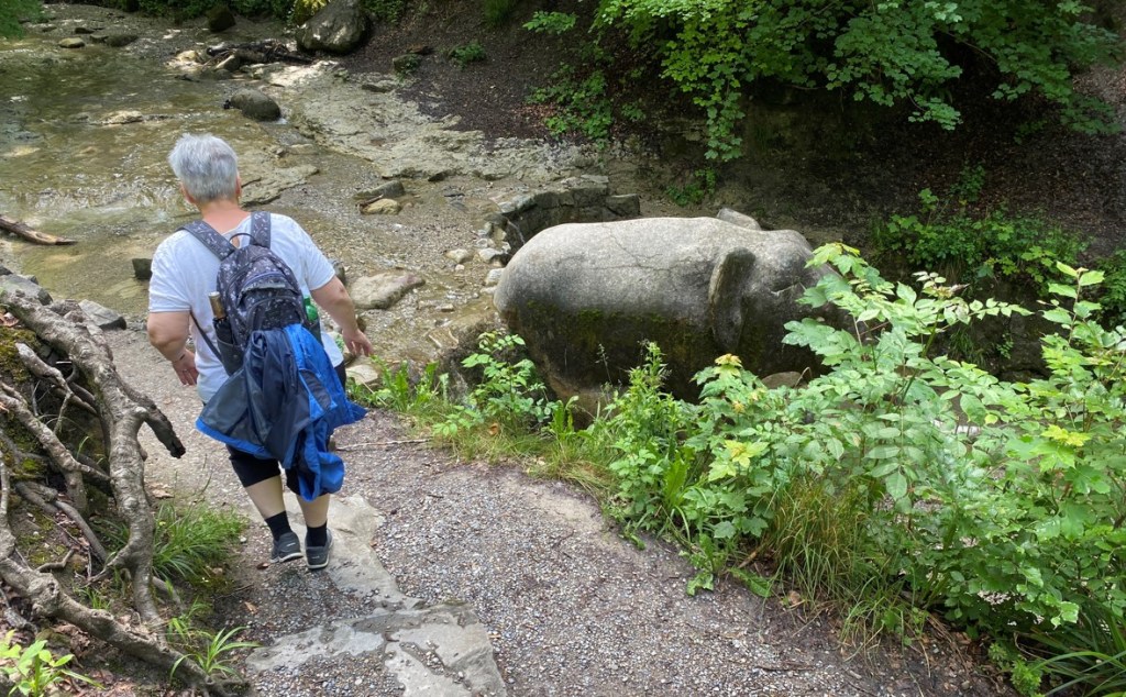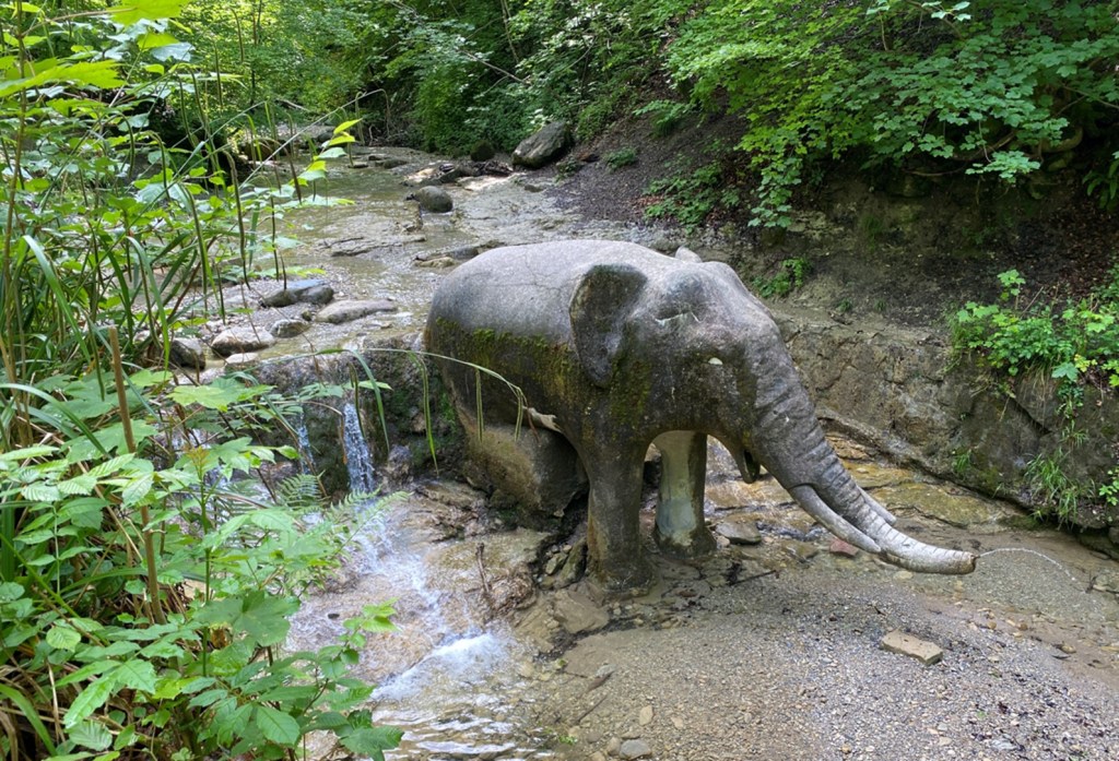 Es weiss niemand mehr, warum dieser Bach im Wald ausserhalb von Zürich ‘Elefantenbach’ heisst. Er hiess nämlich schon 50 Jahre lang so, als der Verschönerungsverein im Jahr 1898 diesen Elefanten darin platzierte. Eine originelle Überraschung beim Wandern bleibt er in jedem Fall.