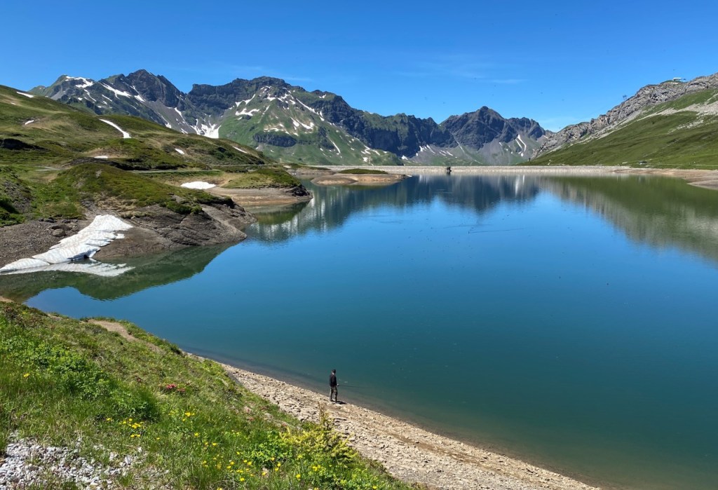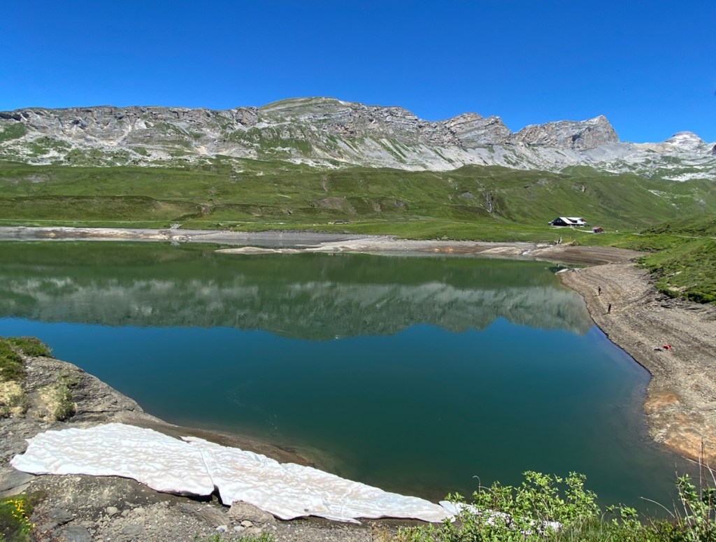 Der Tannensee. Wie der Melchsee wird auch dieser hier zur Stromgewinnung genutzt: man erkennt die Staumauer in Bildmitte. In einer guten Stunde hat man den Tannensee gemütlich umrundet. Im Moment hat er wenig Wasser, dafür trifft man hin und wieder auf ein letztes Schneefeld am Wegesrand.