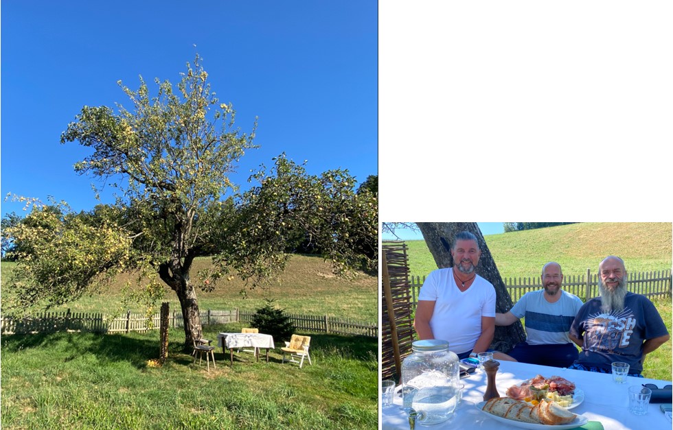 Nach dem Wandern lässt es sich im Schatten des Gravensteiner-Baums gut sitzen und plaudern !