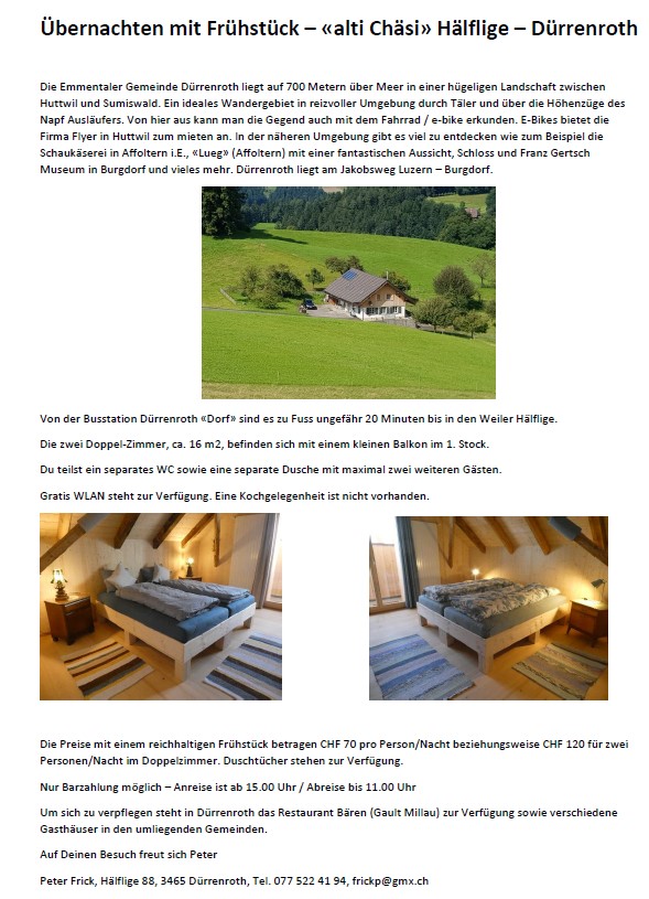Peter hat sich in Dürrenroth eine Käserei gekauft. Dann hat er die eher nüchterne Milchsammelstelle in ein richtig gemütliches Wohnhaus verwandelt und hat nun zwei Zimmer zu vermieten an B&B-Gäste.