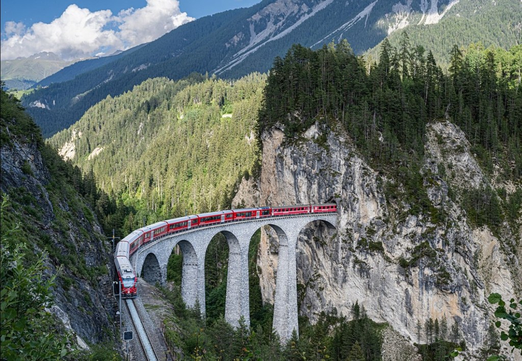 Diesen Titel hat er sich redlich verdient, benötigt er doch 8 Stunden für die 291 Kilometer zwischen St. Moritz und Zermatt. Er überwindet dabei Steigungen von bis zu 12.5%, überquert jede Menge Brücken (die imposanteste davon ist das 142m lange Landwasserviadukt bei Filisur in 65m Höhe) – und offenbart die herrlichsten Aussichten durch die grossen Panoramafenster.