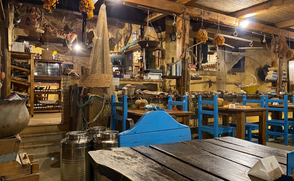 Man sieht sie beinahe nicht, die Reception in Bildmitte. Links davon gibt es einen kleinen Laden – und überall Fischernetze, Bojen und Muscheln. Und Kürbisse. Ein herrliches Durcheinander !