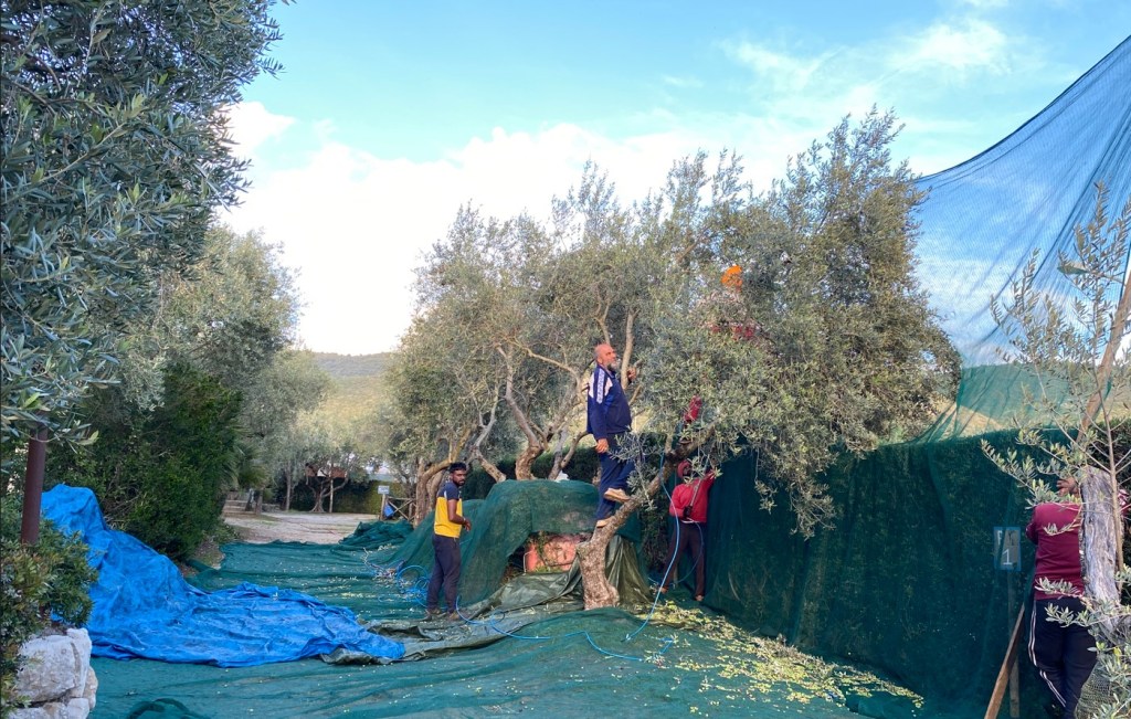 Auf dem Platz ist die Olivenernte beinahe abgeschlossen. Ein Inder mit Turban, zwei Afrikaner und ein Italiener an der Arbeit