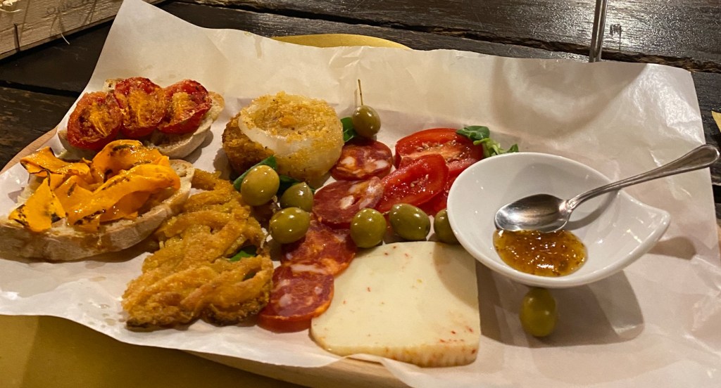 Es gab eigene Oliven vom Platz, je eine Tomaten- und Kürbis-Bruschetta neben einer Art Rösti-Tätschli, rassige Salami, reifer Käse mit Feigensauce und eine panierte, frittierte Gemüsezwiebel: delizioso !