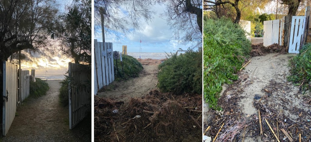 Einmal vorher, zweimal nachher. Das Meer hat es geschafft, in der Nacht einen Wall aus Meer-Grünzeug bis zum Strandtor zu schieben (ganz rechts vom Strand aus gesehen