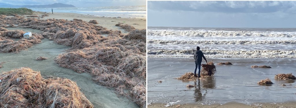 Dieses Schwemmgut bedeckt den ganzen Strand und sieht aus wie Schnüre – es sind aber tatsächlich Pflanzenteile. Der Angestellte rechts sortiert den mitgeschwemmten Abfall aus und bietet dem Meer das Grünzeug schubkarrenweise zum wieder Mitnehmen an (das salzige Material eignet sich nicht als Kompost).