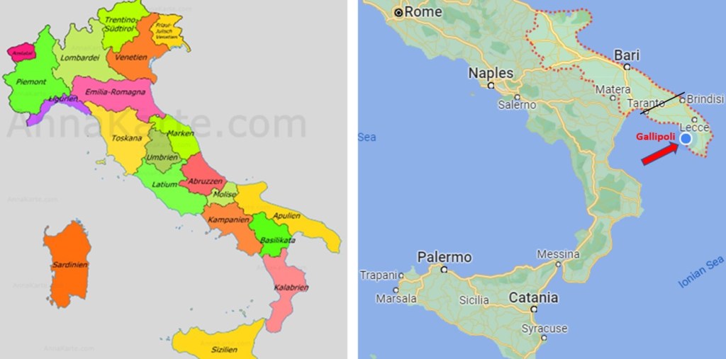 Er kam, als ich las, dass es auch in der Türkei eine Halbinsel und eine Stadt mit dem Namen Gallipoli gibt ! „Schöne Stadt“ bedeutet das in griechisch. Da haben wir es wieder, das ‘Gleiche-Namen-Problem’, welches noch keines war, als die Menschheit zu Fuss oder mit Ochsenkarren unterwegs war..