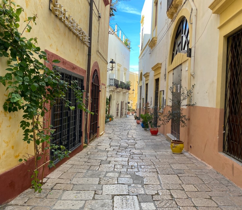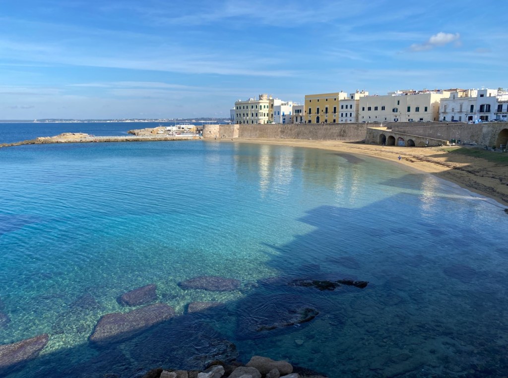 Ich andrerseits möchte etwas mehr von Apulien sehen, denn eigentlich kenne ich erst Alberobello. Wir hatten abgemacht, dass wir eine Flasche Wein teilen würden in Gallipoli. Wenn das kein Grund ist ! Hier hatten wir auch prompt viel Spass miteinander, tranken unsere Flasche Wein (und so..) an jenem Abend – und für die nächsten zwei Tage hielt ich mich freiwillig an Wasser zu den Mahlzeiten.. 😊
