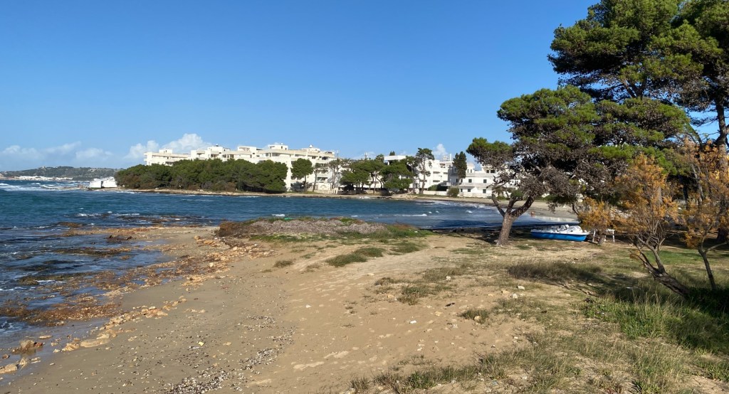 Aber erst noch dies, wenn ich schon am Lamentieren bin: diese weissen Wohnblöcke stehen im Dorf gleich um die Ecke von hier. Im Sommer geht dort Tag und Nacht die Post ab mit touristischem Hochbetrieb, und für den Rest des Jahres ist es eine der viel zu zahlreichen Geisterstädte am Meer. Bis die Touristen (auch die einheimischen) wieder kommen, wohnt dort praktisch niemand von November bis Mai.
