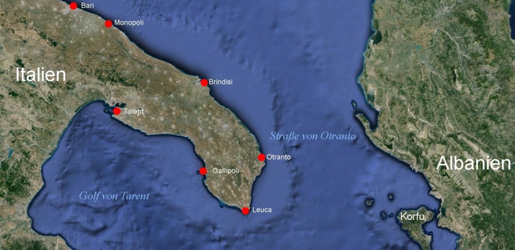 Zwischen Italiens Otranto und dem albanischen Ort Vlora liegen gerade einmal 71 Kilometer, und auf dieser schmalen ‘Strasse von Otranto’ herrscht ein reger Schiff- und Fährenverkehr.