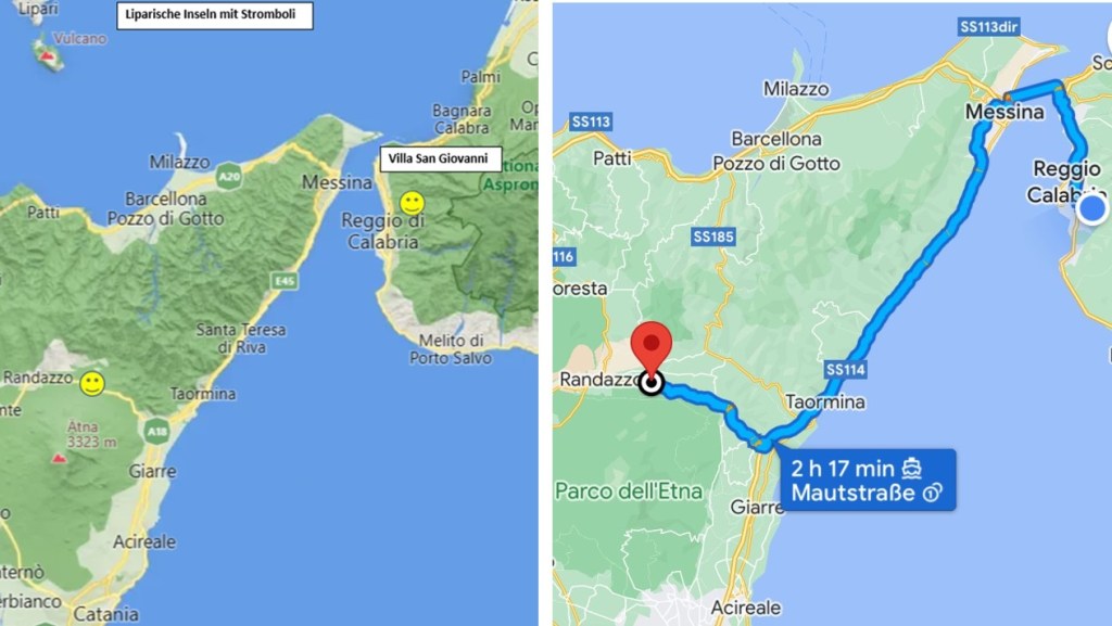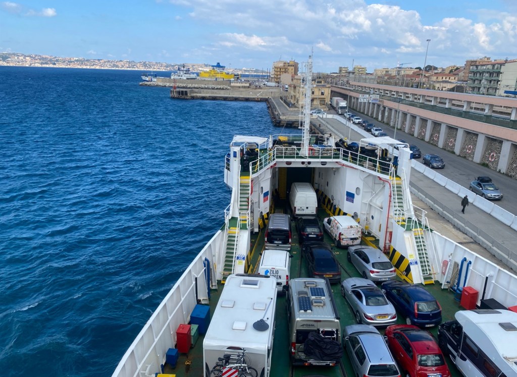 Mit der Fähre von Villa San Giovanni nach Messina: 40 Minuten warten, 20 Minuten Reise durch die Strasse von Messina: 10 Kilometer Reisedistanz inklusive Aus- und Einfahrtschwenker bei den Häfen.