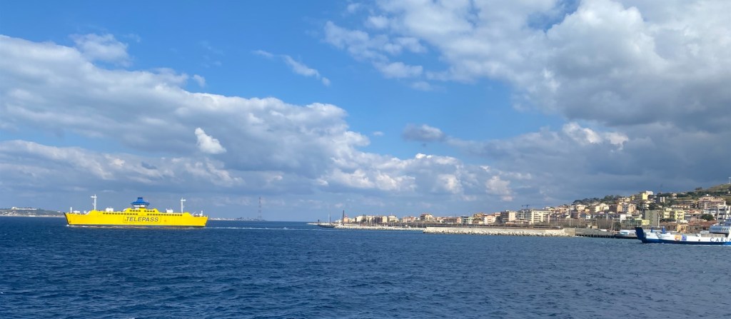 Es geht los. Rechts Villa San Giovanni bzw das Festland.. (Ich fand vor allem das sonnengelbe Schiff hübsch…)