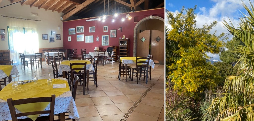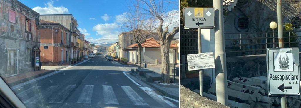 Ehe es draussen richtig kalt wurde am Abend, bekam ich im warm geheizten Restaurant ‘Bianca di Navarra’ feinen Wein ausgeschenkt (‘Etna Rosso’ genannt und aus Nerello Mascalese Trauben), dazu gab es Schnitzel und knusprige Pommes. Das junge Wirtepaar wird in ein paar Wochen in Acireale ein anderes Restaurant übernehmen; sie hoffen, dass dort etwas mehr los sein wird als hier.