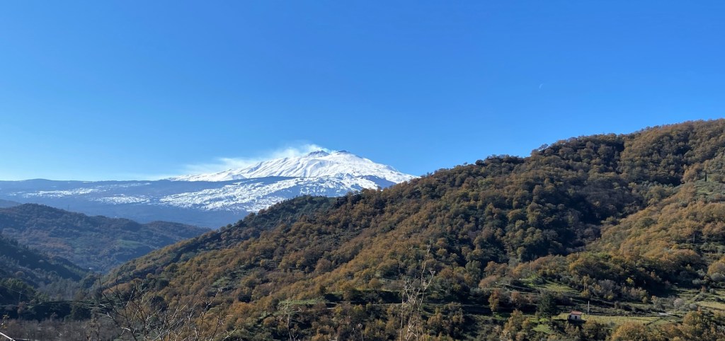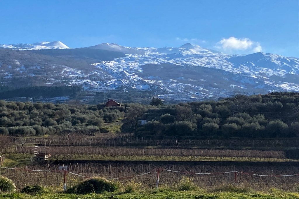 Gleich vor meiner Schiebetüre: Das ist sie, die ‘kalte Schulter’. Alles da hinten mit Schnee drauf ist ‘Der Ätna’, halt von der ‘anderen Seite’ aus gesehen ! Diesbezüglich aufgeklärt wurde ich von einem jungen Rebenhelfer aus Napoli, welcher mit seinem VW-Bus auf den Platz gefahren kam zum Abwaschen und Duschen, und er hat mir erzählt, dass man die Rauchsäule bei einem Ausbruch jeweils von irgendwo dort – also von hinter den Bergen – aufsteigen sehe..