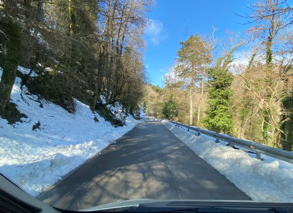 Auf 1100 Metern traf ich unvermittelt auf Schnee und war ebenso dankbar für die trockene Strasse wie für den gänzlich ausbleibenden Gegenverkehr..
