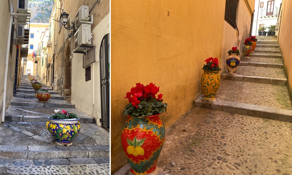 Marketing vom Feinsten ! Cefalù hat sich diese schönen, bemalten Keramiktöpfe als Wahrzeichen ausgesucht; sie stehen überall im Dorf auf den steilen Treppen. Wenn man ihnen folgt, um sie sich aus der Nähe anzusehen, ist man – zack ! – oben beim Parco della Rocca (also dem zweiten Wahrzeichen ‚Felsenkopf‚), und schon ist man am Wandern… Raffiniert, nicht ? Da die Aussicht von da oben traumhaft ist, lohnt sich die Mühe auf jeden Fall !