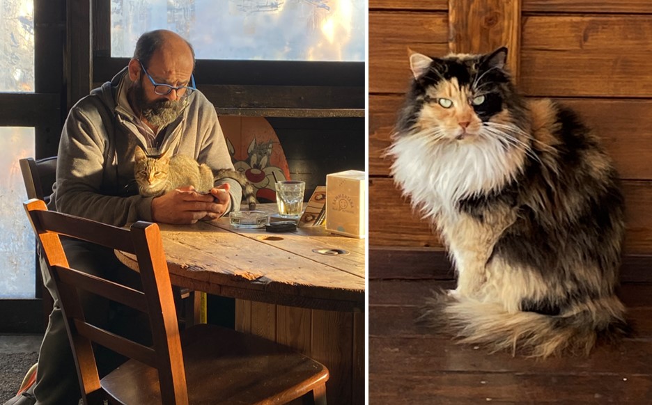 Irgendwie passt hier die Katze im Arm des Wirtes auf den Restauranttisch – und der mürrische Kater unter den Tisch..