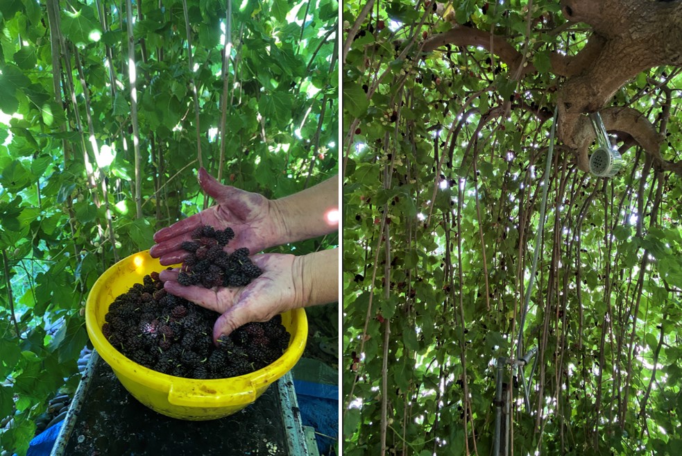 …und vom kleinen Maulbeerbaum pflücken wir momentan täglich ein grosses Becken voller Beeren und haben bestimmt schon 20 Kilo davon tiefgekühlt oder zu Konfitüre verarbeitet. Sie eignen sich aber auch zum Einlegen in Alkohol für künftige Desserts.