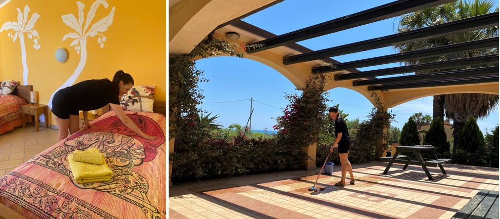 Wir sind drei Volontärinnen und arbeiten im Garten, richten Zimmer und Appartments her für neue Gäste oder fahren am Donnerstag gemeinsam auf den Markt in Licata, um Lebensmittel für die ganze folgende Woche einzukaufen. Letzteres auch deshalb, weil wir zwar direkt hinter den Dünen am Strand leben – aber immerhin eine halbe Stunde vom nächsten Laden entfernt. Wir kochen und essen gemeinsam und geniessen die entspannte Kameradschaft.