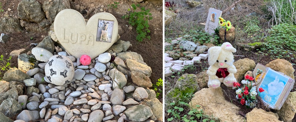 Gleich neben dem grossen Friedhof liegt im Wald ein kleiner, wilder für Haustiere. Dort ruhen Hunde, Katzen, Häschen und Meerschweinchen und oft ihre Lieblingsspielzeuge. Süss.