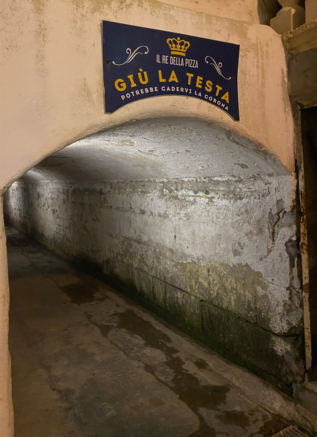 Dieser Durchgang vom Parkplatz zur Pizzeria ‚La Giara‘ ist gerade einmal 1.60m hoch. Währenddem die grösseren Herrschaften ihre Hutzelmännchen-Imitationen gaben unter ‘Autsch’ und ‘Shit’, schritt ich hoch erhobenen Hauptes durch – mit intakter Krone ! Das Klein-Sein (und kleiner Werden) hat durchaus gewisse Vorteile ! 😊