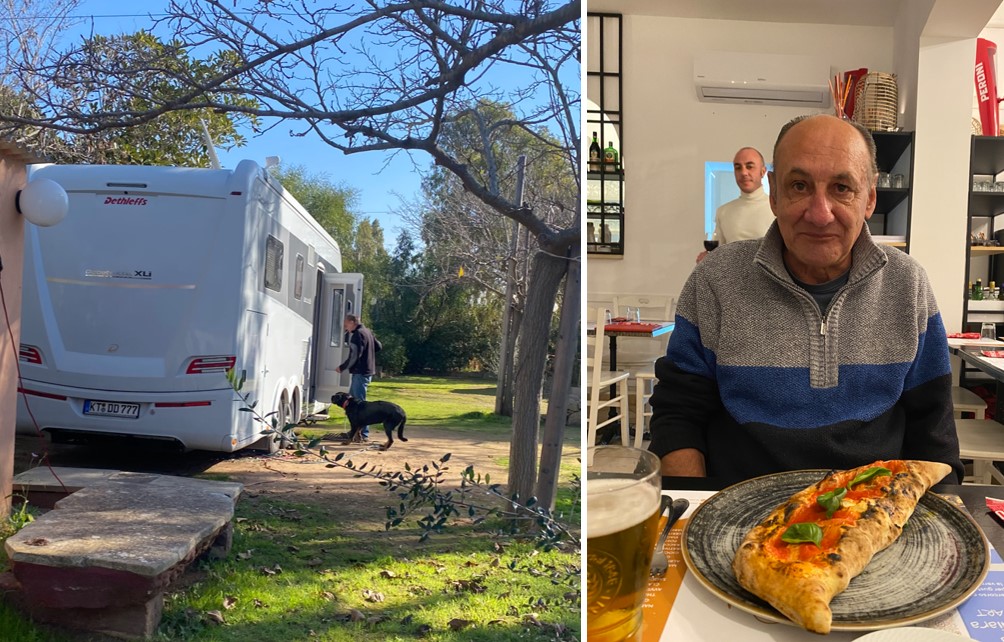 Ganz nebenbei gibt’s noch einen weiteren Bonus: die Monatsmiete für meinen Platz ist 400 Euro inklusive Strom und heisses Wasser in den immer sauberen Duschen – es zieht dort dafür etwas. Das Ristorante Torre Sabea ist in 20 Metern Entfernung und das Mittelmeer gleich über der Strasse. Beinahe ideale Wohnbedingungen, nicht ? Finde ich auch !