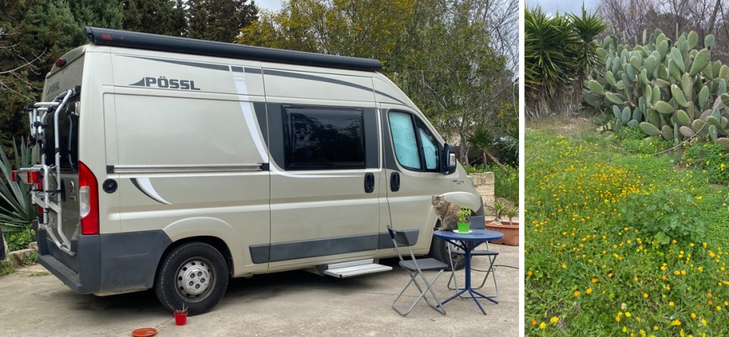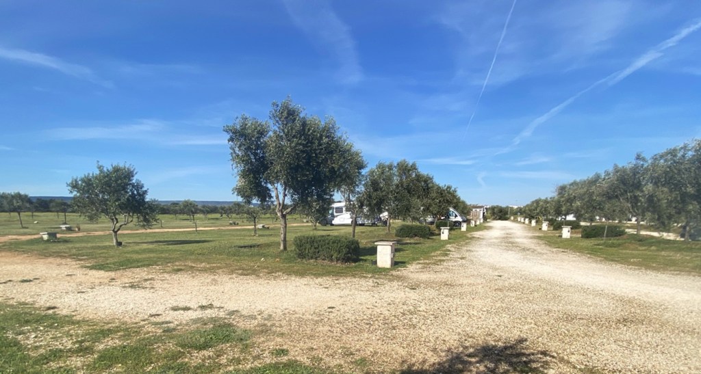 Geschafft ! Angekommen auf dem beinahe leeren Stellplatz Getsemani in Villanova bei Ostuni. Erst stand ich da ganz alleine, aber dann trafen doch noch ein paar weitere Wohnmobile ein. Hier wird offensichtlich nicht über längere Zeit gewohnt. Während meinen drei Tagen leerte sich der Platz praktisch jeden Morgen – und jeden Abend waren wir wieder zu fünft oder sechst.