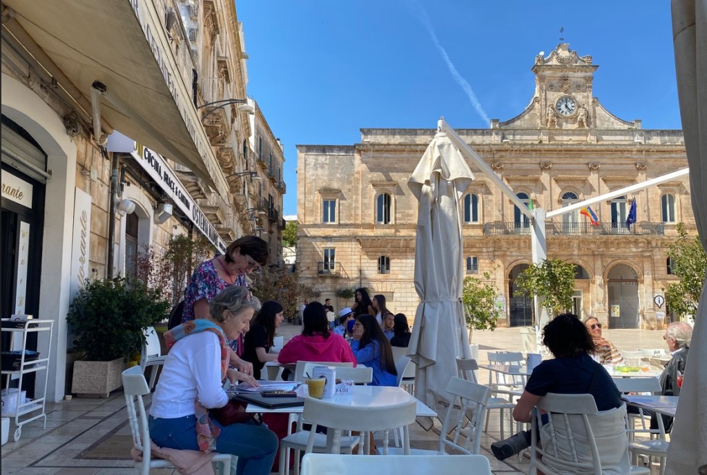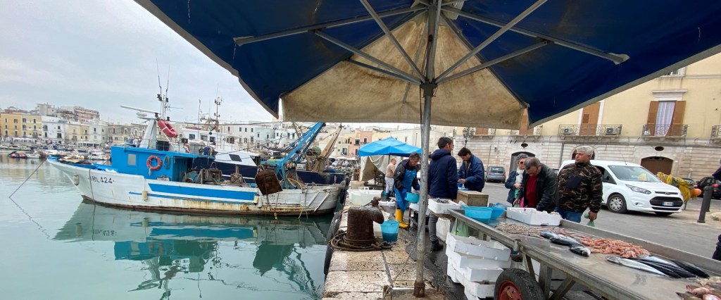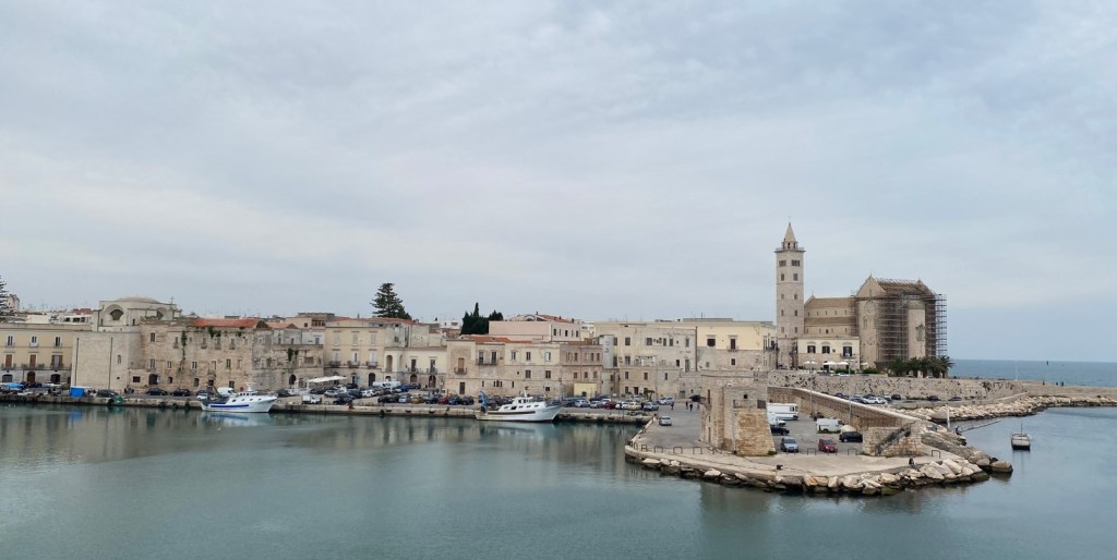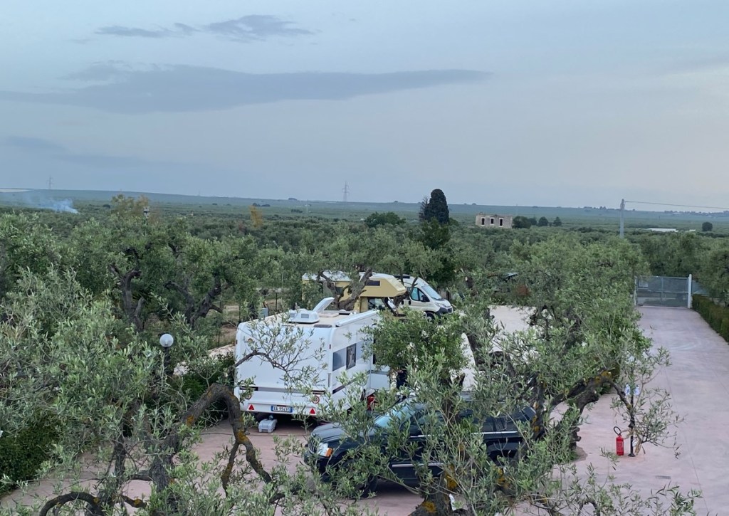 Trani. Ich fuhr nur etwa 150 km weiter, und schon bin ich bei Francesco auf dem Camperstop La Pupetta ausserhalb von Trani inmitten riesiger Olivenbaumfeldern -zusammen mit einem italienischen Journalisten-Paar im ‘Home-Office’ und einem Franzosen-Paar in den 80ern, die jeden Abend tapfer in ihren Landcruiser klettern.