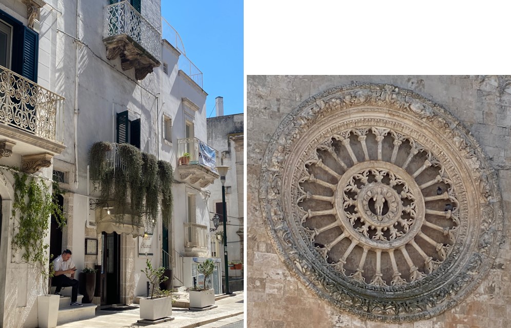 Links ‘Die Ruhe des Kellners vor dem Abendservice’ vor einer Osteria, rechts die riesige Rosette am Dom von Ostuni.