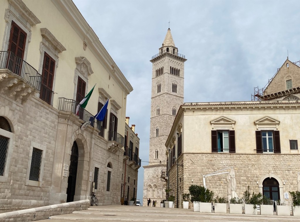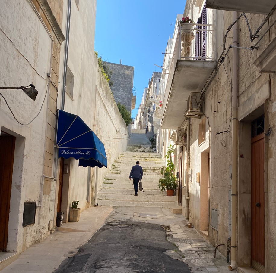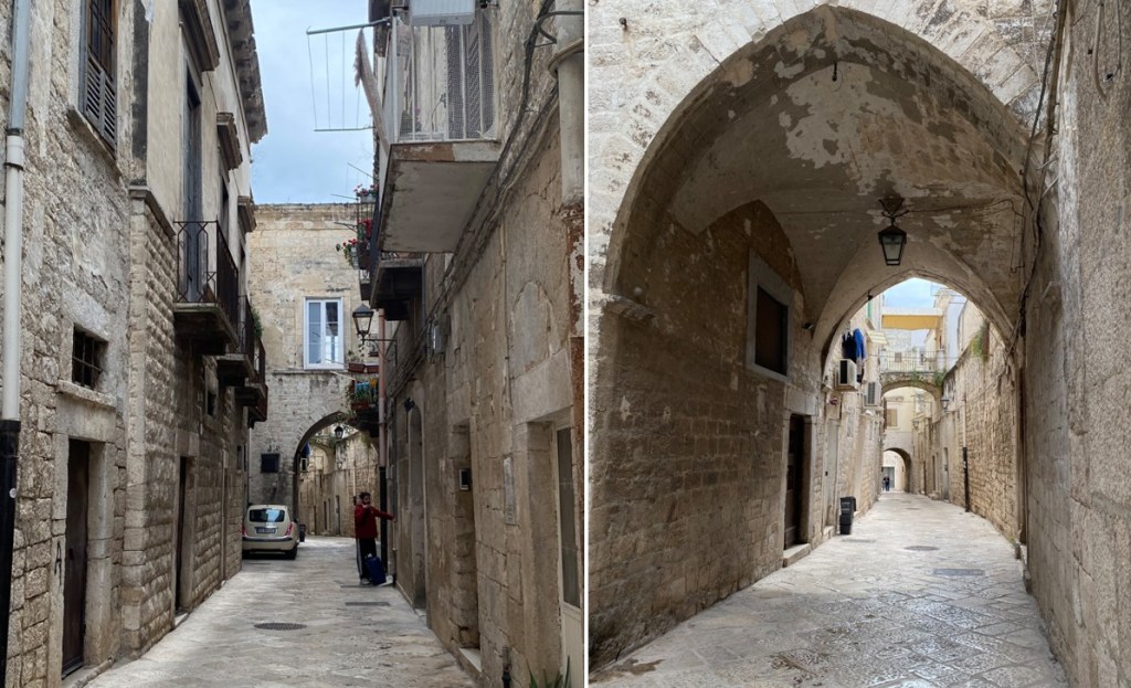 In Trani gibt es viele dieser schmalen Strassen mit Übergängen, und gefühlt hinter jeder zweiten Türe oder dem offenen Fenster reden gerade Leute mit jemandem im obersten Stock – oder ein Radio plärrt die Nachrichten. Lustig für einen Besuch; wohnen möchte man hier eher nicht..