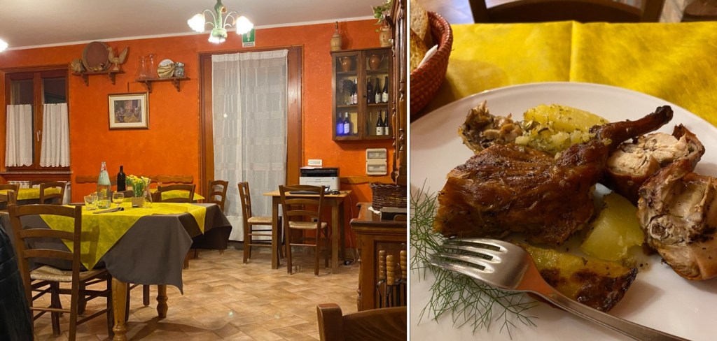 Mein Platz auf dem Agricamping in Fano war nett, aber… Im erdrückend engen, mit Plastikblumen dekorierten Restaurant und lauter Radiodiskussion im Hintergrund wurde mir von der sehr kühlen Platzchefin das bisher ungeniessbarste Essen in Italien serviert: ofengetrocknetes Kaninchen an matschigen Bratkartoffeln, immerhin garniert mit einem frischen Dillzweig. Salat und Wein waren aber gut. Na ja, kann ja mal passieren; wir wollen nicht kleinlich sein, und ich wollte sowieso am nächsten Morgen abreisen.