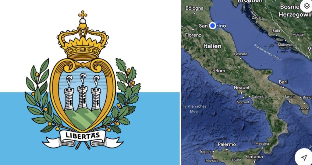 Die Repubblica di San Marino ist mit ihren 61 km² das drittkleinste Land Europas nach Vatikanstadt und Monaco (und noch vor Liechtenstein, Malta und Andorra), und es ist ganz von Italien umgeben.