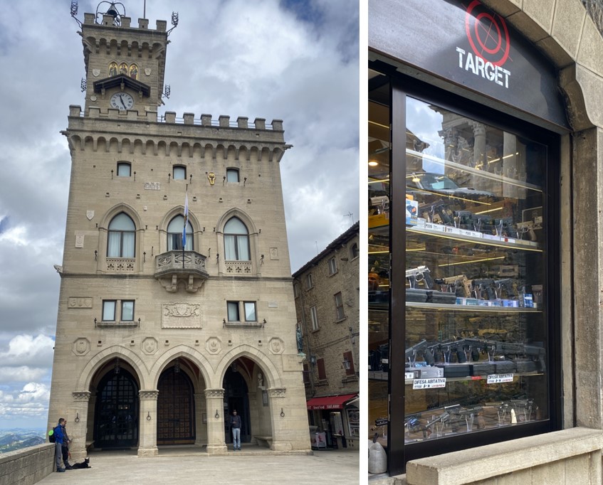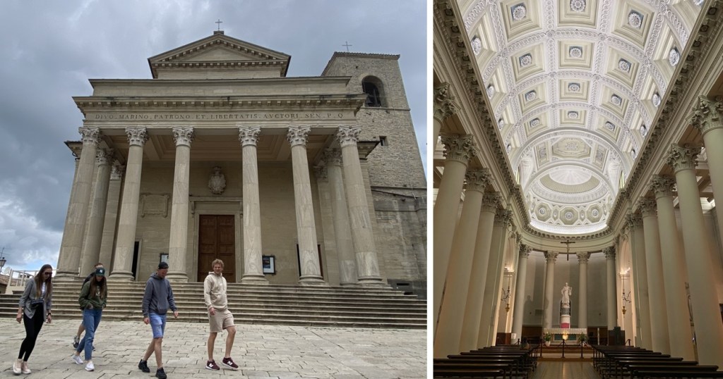 Also gut, Kultur (hüstel): Die Basilica di San Marino wurde in den 1830er-Jahren im klassizistischen Stil erbaut und ist (natürlich) dem heiligen Marino gewidmet. Der romanische Glockenturm blieb von einem Vorgängerbau aus dem 17. Jahrhundert übrig, und die Beiden passen überhaupt nicht zusammen. Das einzige, was sie gemeinsam haben, ist je ein mageres Kreuz auf dem Dach. Sechs korinthische Säulen säumen das lichte, mittlere Kirchenschiff auf beiden Seiten. Ecco fatto ! 😊