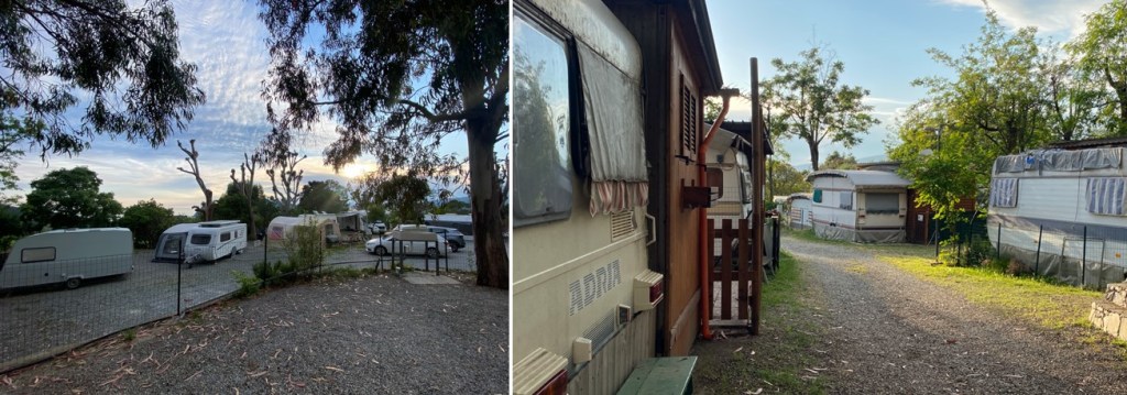 Bild rechts: die triste Stimmung, die in allen Dauercamper-Lagern herrscht, bis die Besitzer wieder kommen in einem Monat oder in einem Jahr..